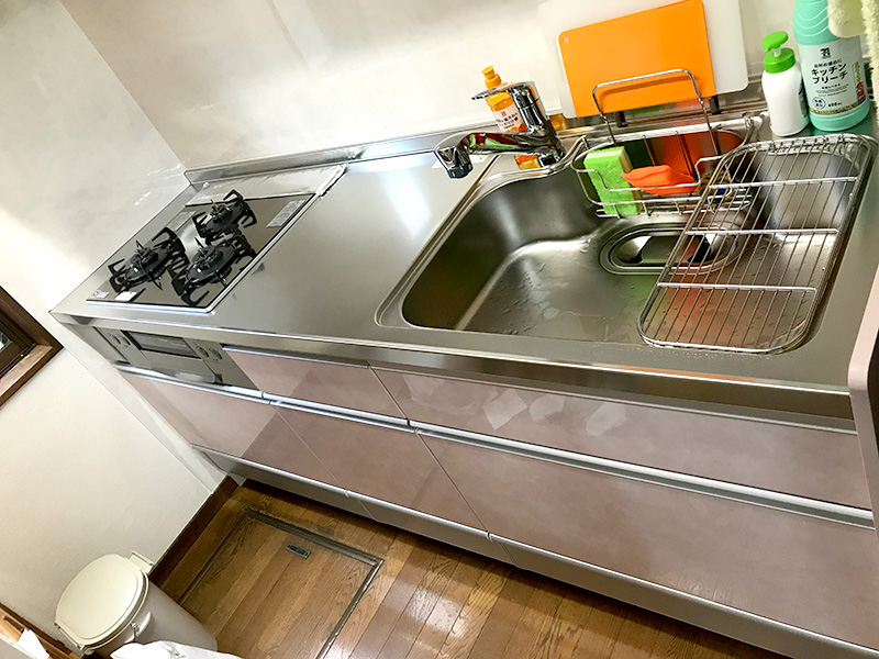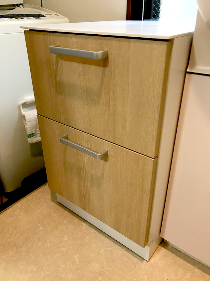 キッチンは開き扉で収納量が少ないと思い、まずは収納量の向上をいたしました。耐荷重も考え、クリンレディに。そうすることによって天板に物がなくなりお掃除もしやすく、引き出しもスムーズになるのでご提案させていただきました。