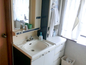 ・洗面台のミラーを収納力のあるもに、また下台もスライド式のものを選び、収納力を充実させました。